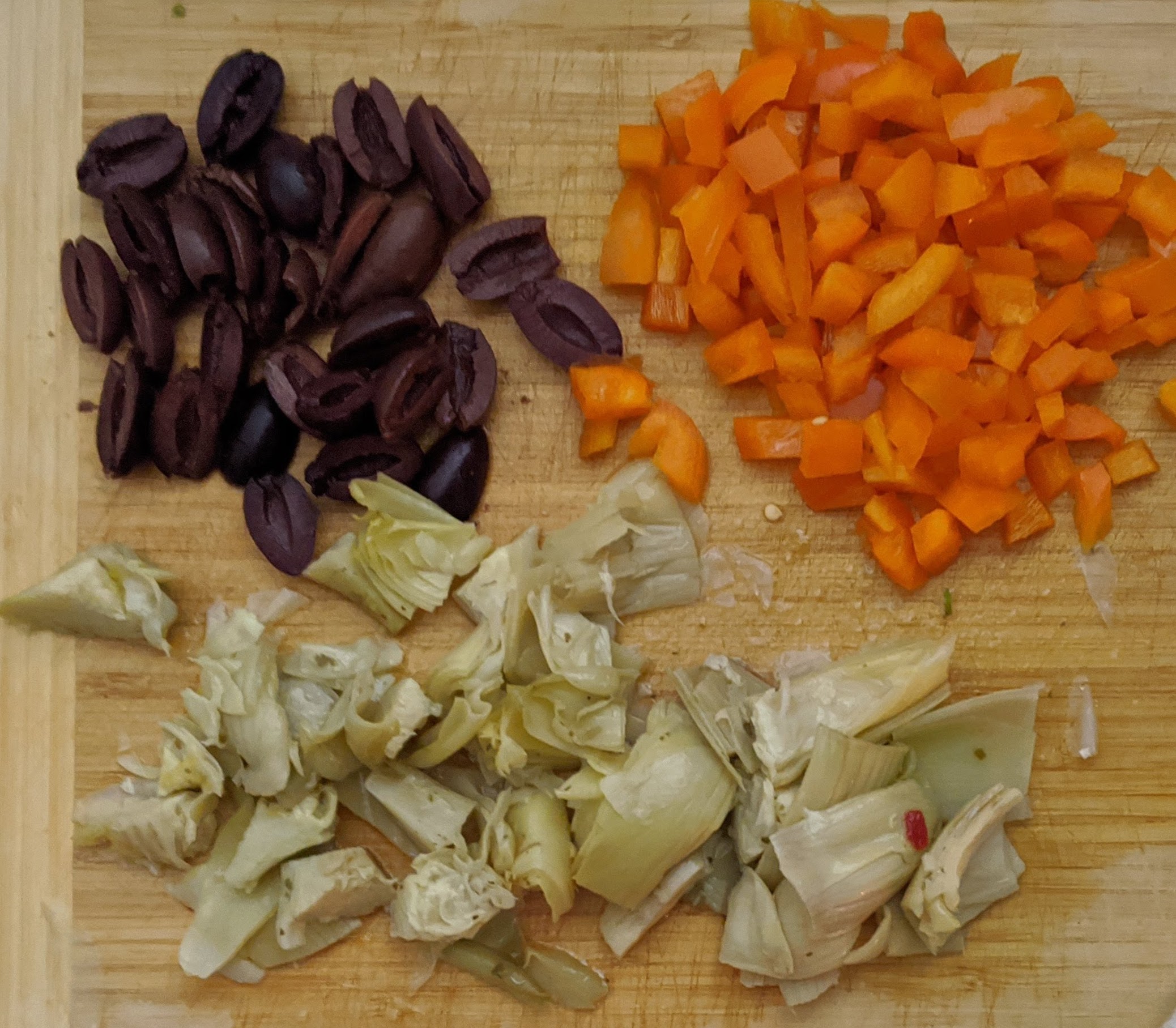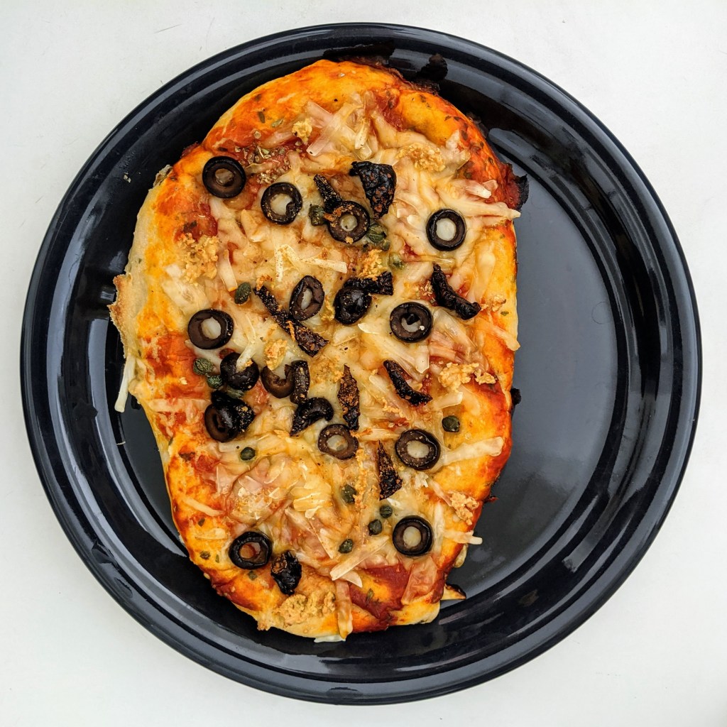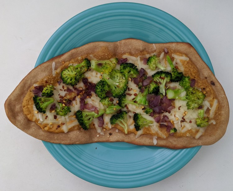 Our goal for this pizza was to generate some heat. Some recipes rely on spicy pepperoni to do the job, but for a vegan pizza that won’t work. Instead, we built layers of heat, starting with a store bought spicy pizza sauce. Diavolo pizzas typically feature peppers of varying heat intensity. We bought roasted red peppers for this purpose but decided against using them. For us, it was a good choice. We loved this pizza as created. Of course you can add slices of habanero or jalapeno or any peppers your heart desires.