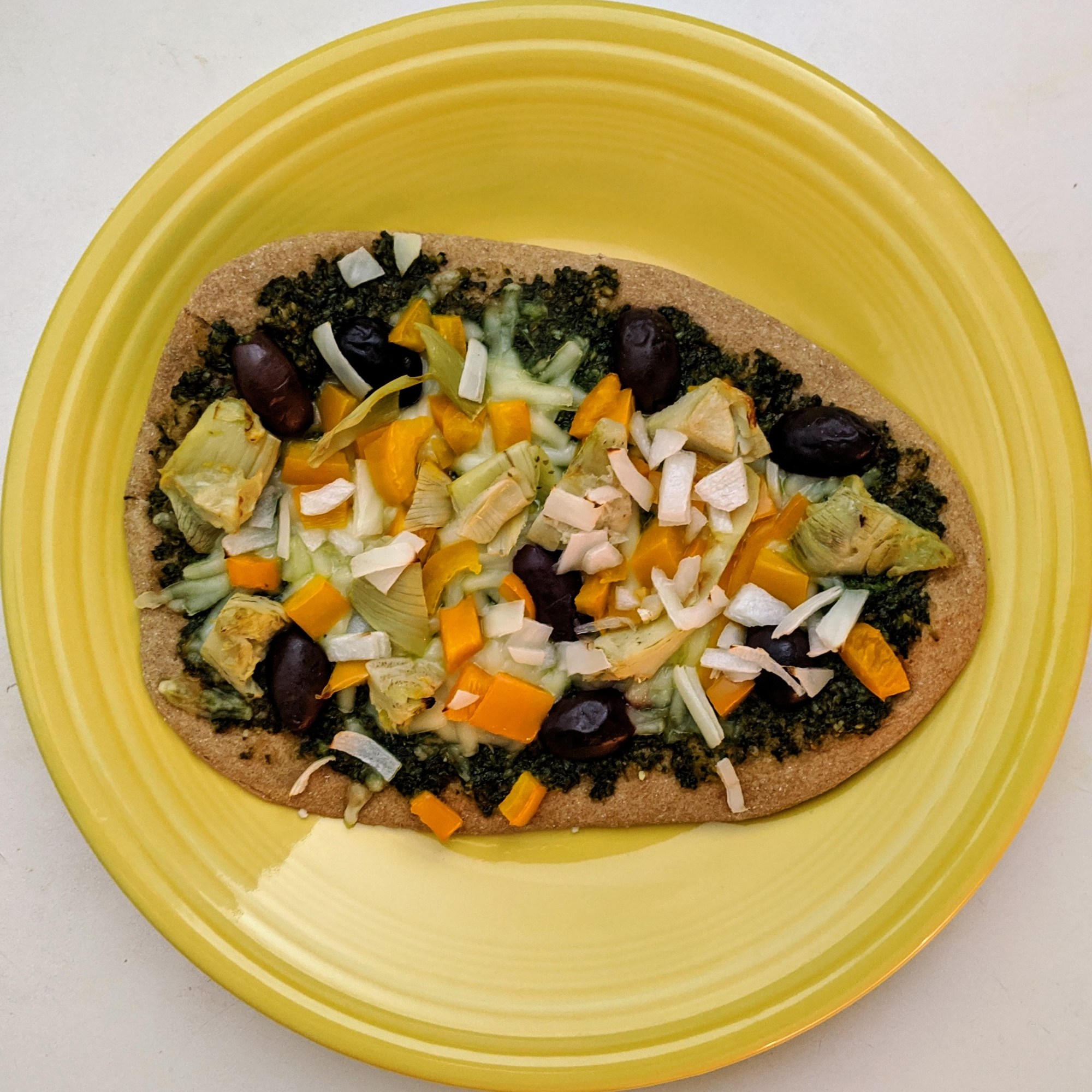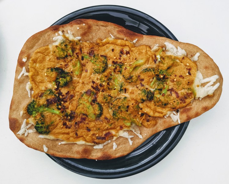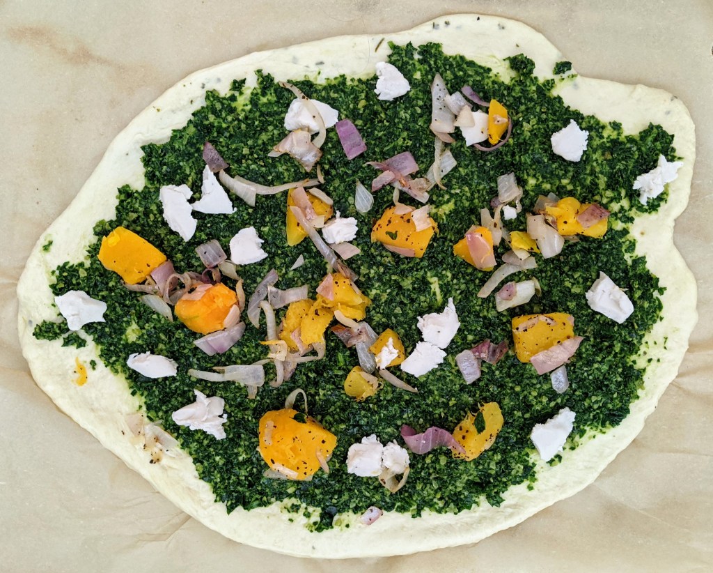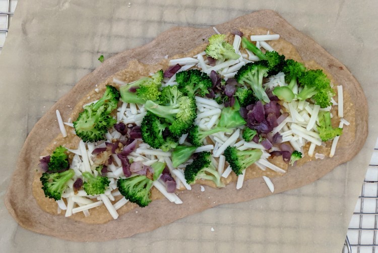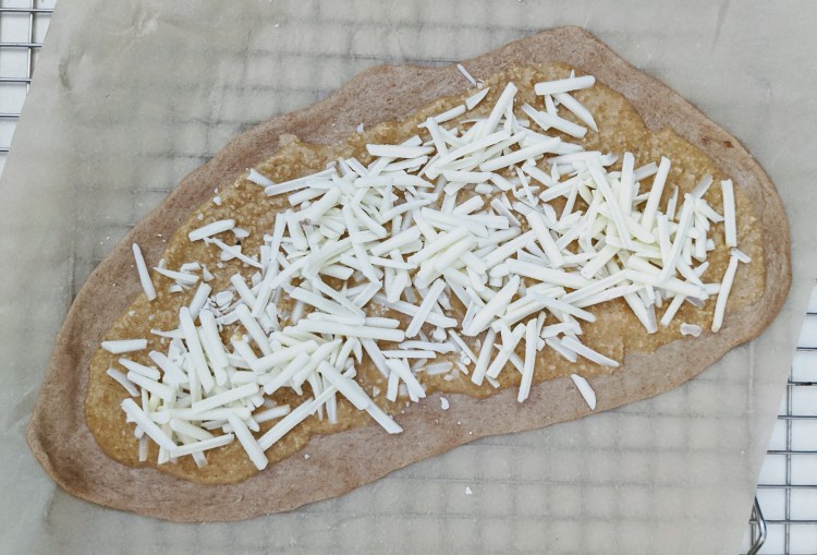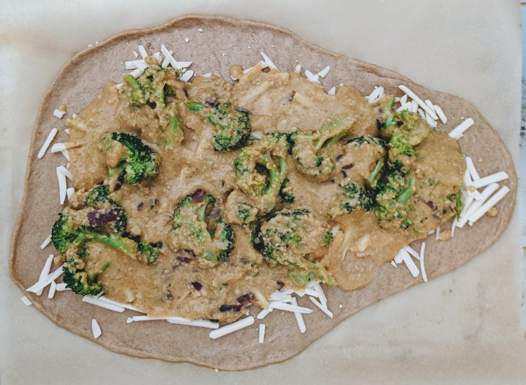 Your deep red pizza is now starting to look white. Add a handful of a good quality shredded vegan mozzarella. We love Violife. It’s made of cashews and coconut oil and it tastes and melts like cheese.