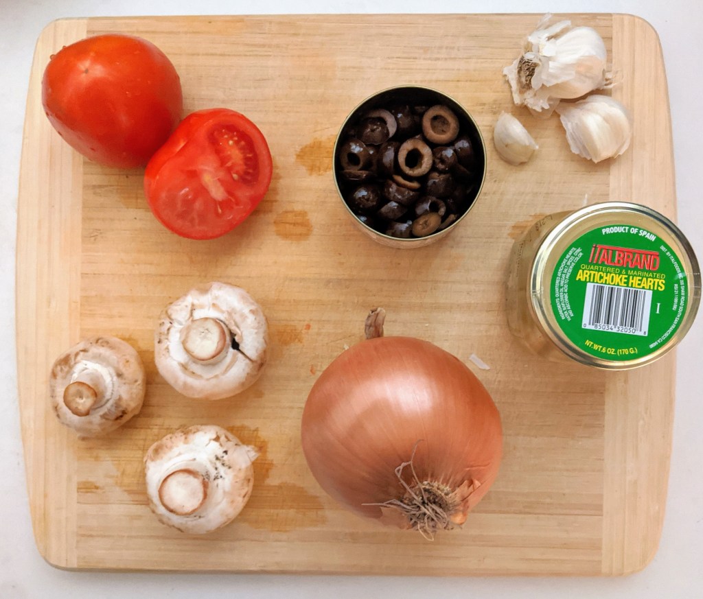 Slice 2 medium tomatoes, sprinkle them with salt, and layer them on the pizza. Using kitchen shears or a knife, cut 2-3 sun dried tomatoes into small bits and toss them around the pizza. Sprinkle some red pepper flakes on the pizza. At this point, your pizza will have a fiery, red, Devilish look.