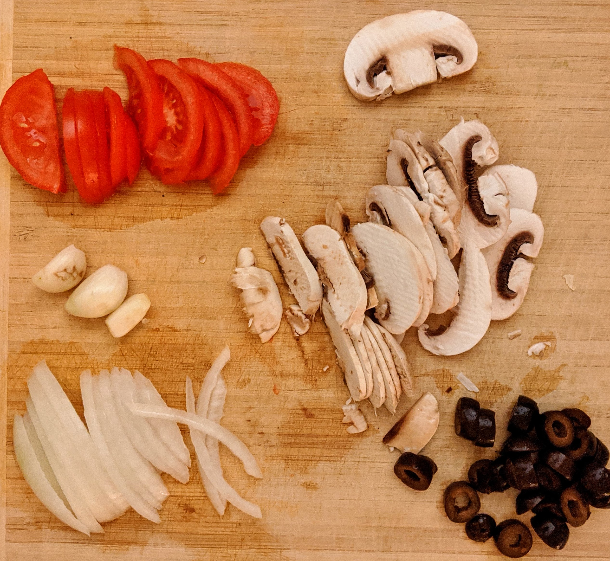 Garlic, vine ripened tomatoes, sun dried tomatoes, red pepper flakes, and spicy pizza sauce, what’s not to like? We like it all, and lots of it!