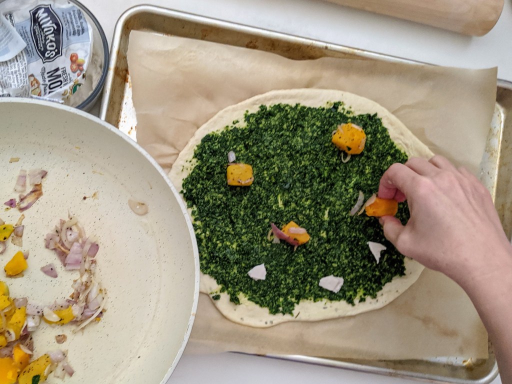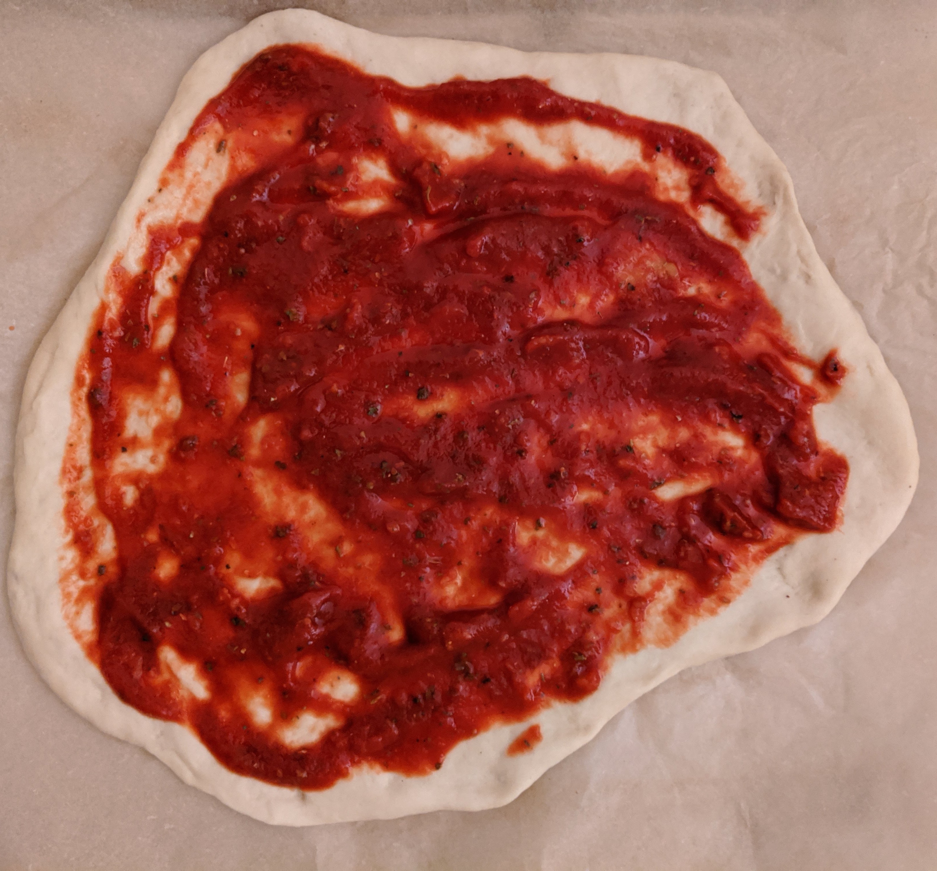 To start, brush olive oil around the edges of the pizza using a pastry brush. Crush a few garlic cloves onto the dough base. Spoon about 1/2 a cup of pizza sauce onto your pizza and spread it out, leaving 1/4 inch crust all around.